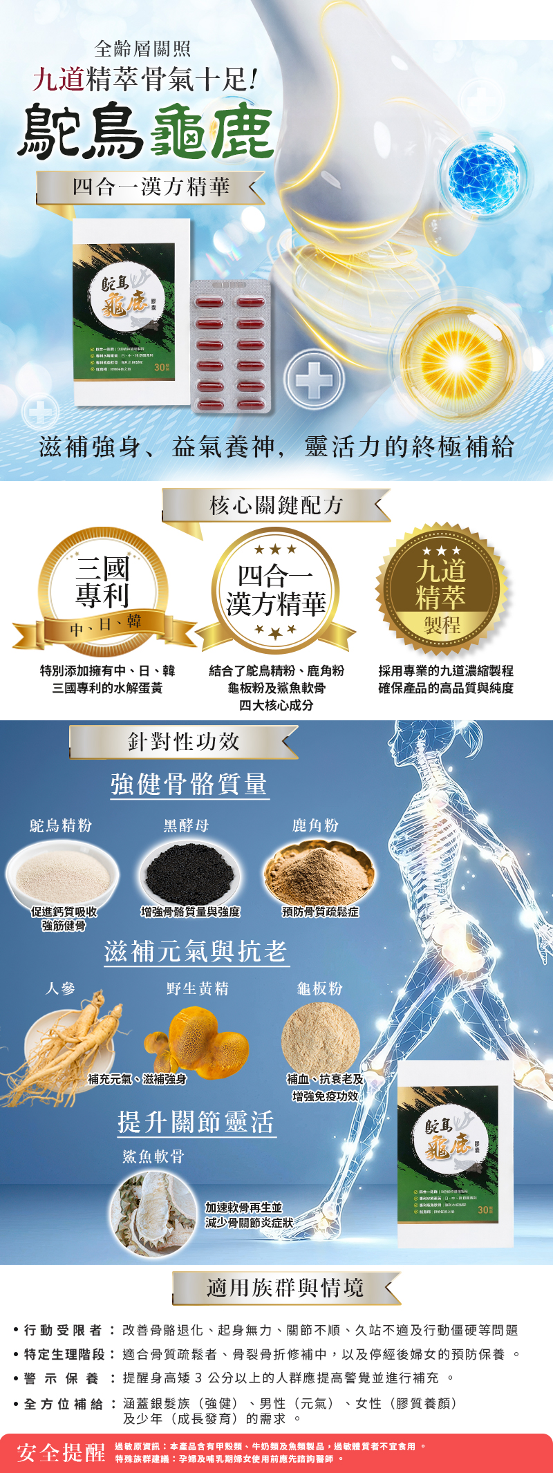 產品特性: ●銀髮族:強健骨骼、增加關節潤滑, ●男 性:增補元氣、益氣養神, ●女 性:豐富膠質、養顏美容, ●少 年:提供成長所需膠質、鈣質。